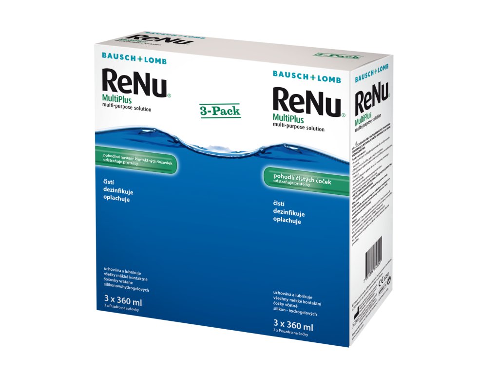 Roztok ReNu MultiPlus™ 360 ml od společnosti Bausch & Lomb zvlhčuje, odstraňuje proteiny, čistí, dezinfikuje, lubrikuje, oplachuje a uchovává všechny druhy měkkých kontaktních čoček včetně silikonhydrogelových. Obsahuje Hydranát® .